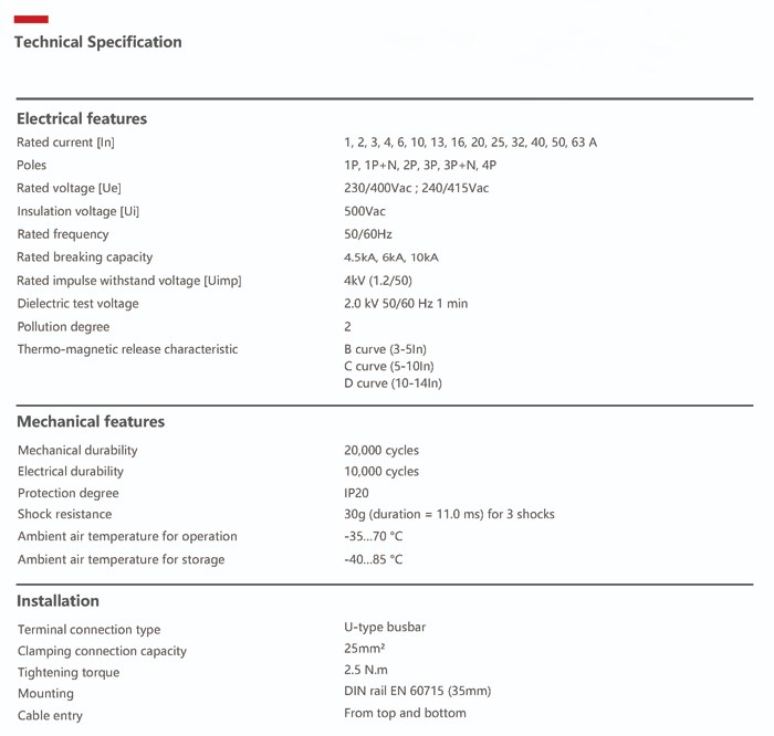 AC Miniature Circuit Breaker VBK-63N Series -18mm - C curve - 2Poles - 6kA - 40A